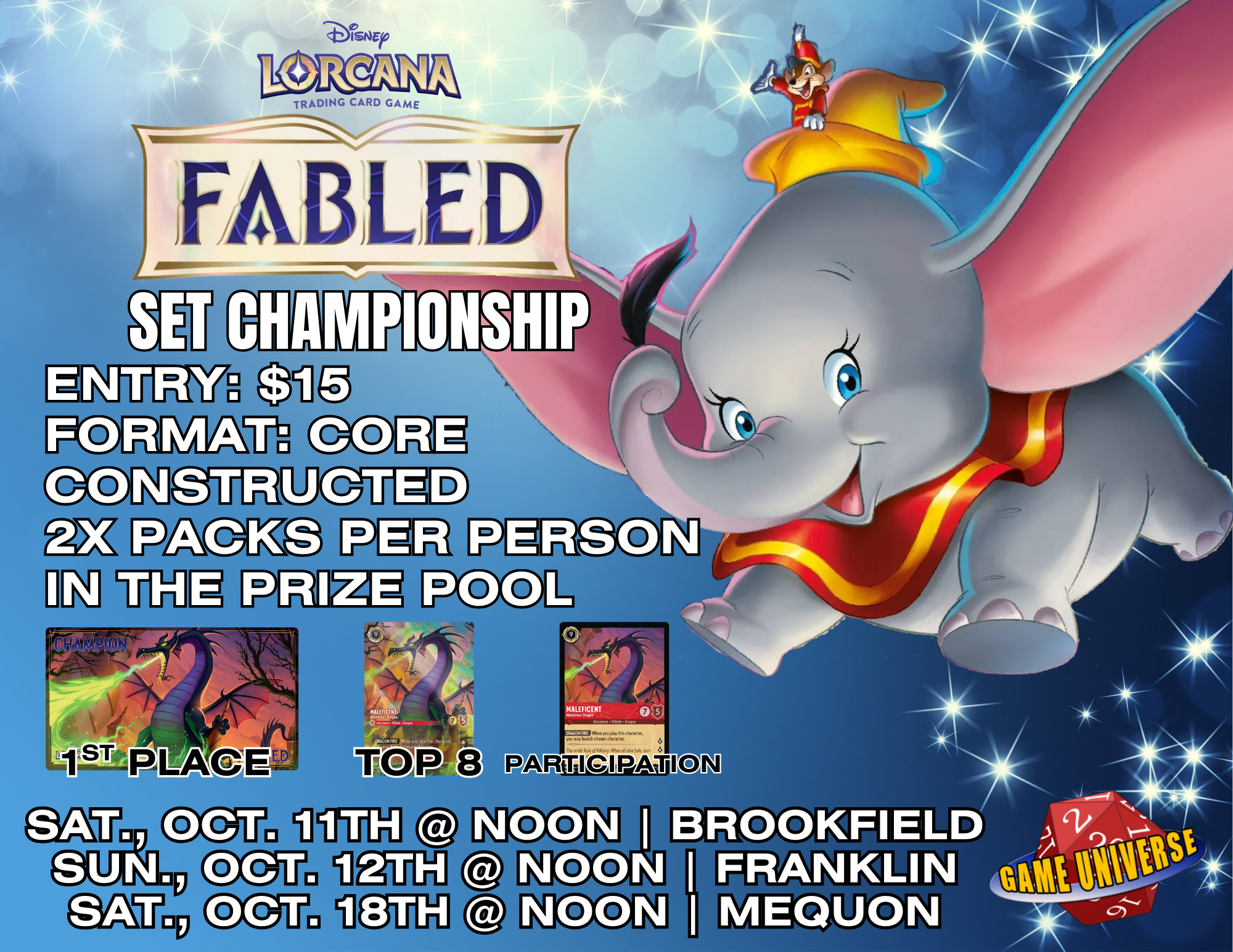 The Lorcana Fabled Set Championship is a tournament for the Disney Lorcana card game. The tournament is played in a Core (Constructed) format, and the rounds are best of three games. The structure of the tournament may include Swiss rounds and a Top Cut, depending on the number of attendees.