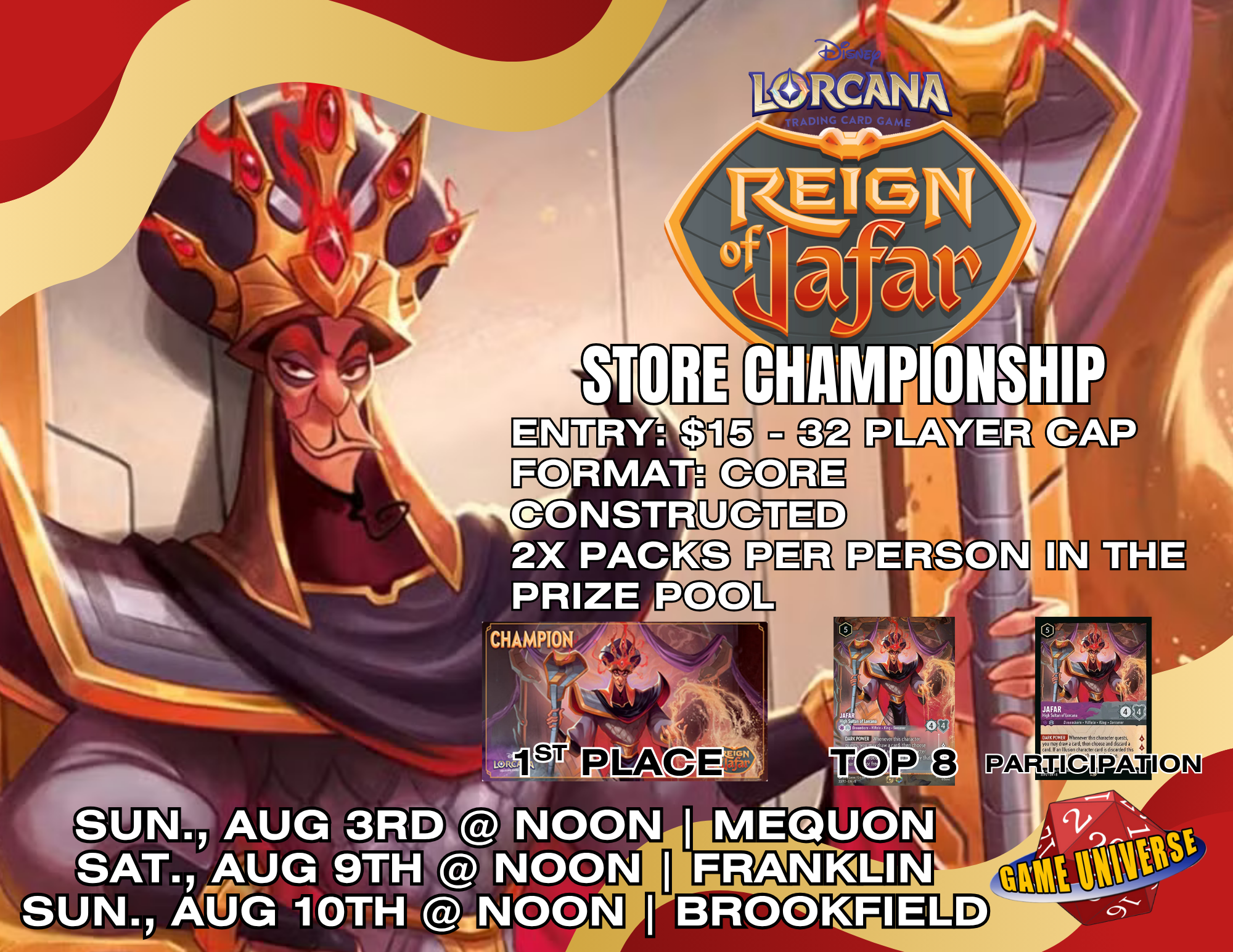 The Lorcana Reign of Jafar Store Championship is a tournament for the Disney Lorcana card game. The tournament is played in a Core (Constructed) format, and the rounds are best of three games. The structure of the tournament may include Swiss rounds and a Top Cut, depending on the number of attendees.
